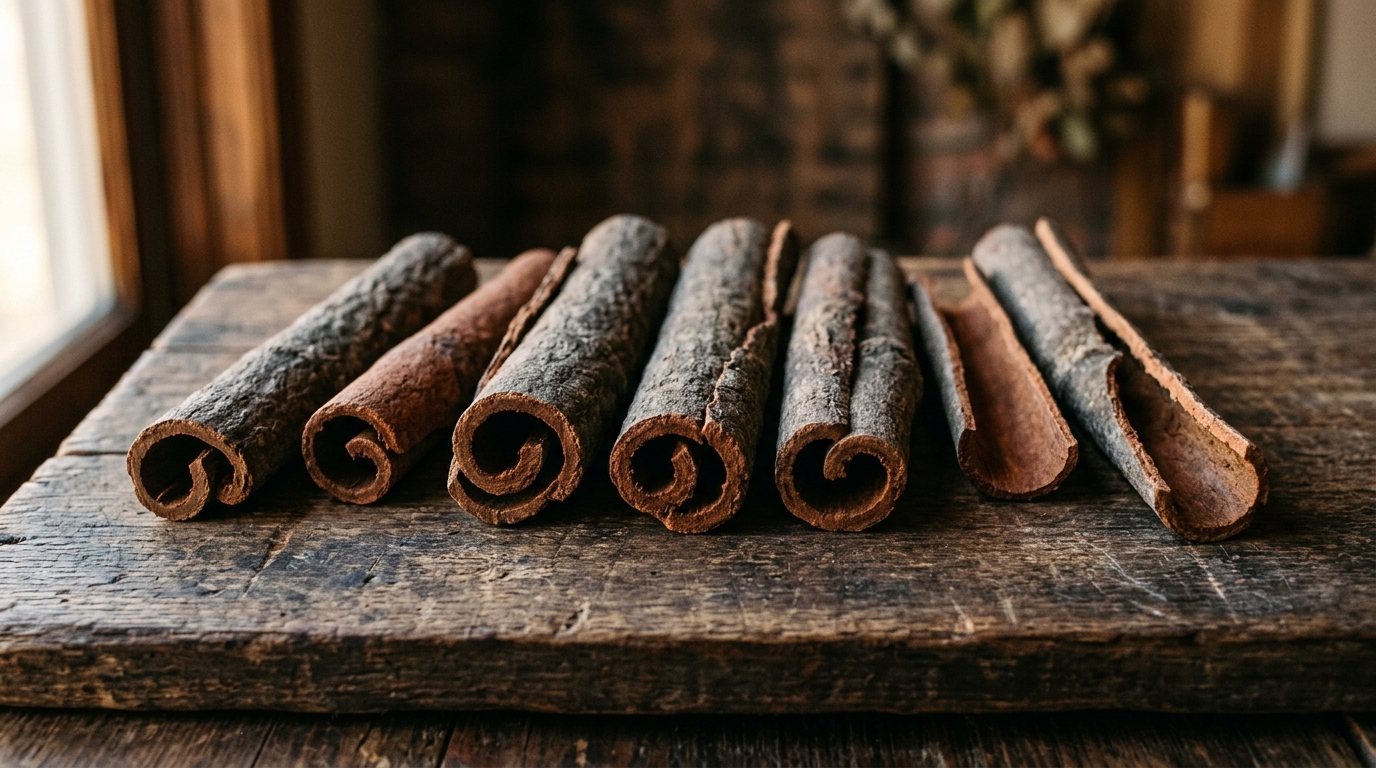 桂皮是樟科植物肉桂的樹皮,主要產於廣西、雲南、廣東。西式肉桂(Ceylon cinnamon)來自錫蘭肉桂,產於斯里蘭卡,外觀比中式桂皮薄,顏色偏淺棕,香氣帶甜、溫和。中式桂皮外皮厚實,顏色深褐,香氣更濃烈,帶著一種木質的辛辣底韻,加熱之後會釋放出一種讓人覺得「這鍋湯有底氣」的感覺。